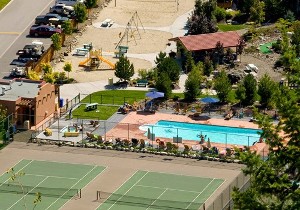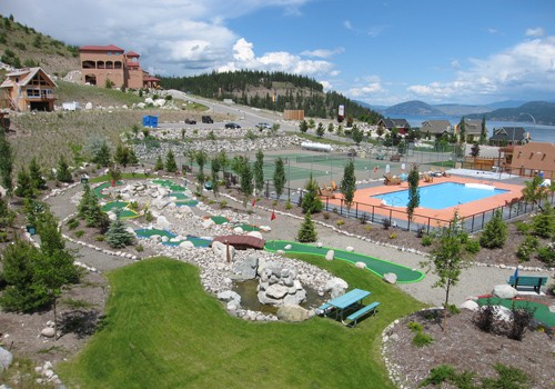 And speaking of amenities! In addition to the beach access, how about two seasonal outdoor pools and three hot tubs, volleyball, two tennis courts, mini golf and even a group barbecue picnic area. All guests have access to the lake with its seasonal aqua park (with trampolines!) for the kids, and the marina. Kayaks and paddleboards are also available for rent. There are trails right behind the resort for hiking, biking and ATV’ing. Golf and wineries are a short drive away.